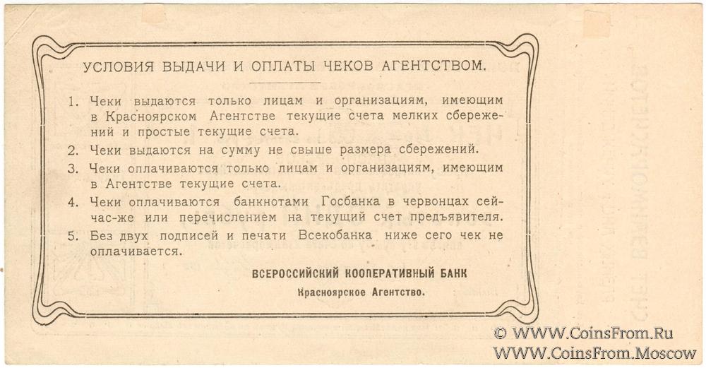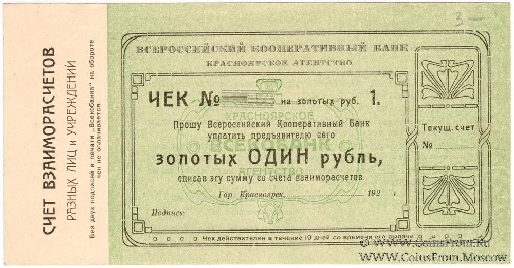 Чек 1923 г. в золотых рублях. Бланк без номера. Красноярское Агентство. Всероссийский Кооперативный Банк.