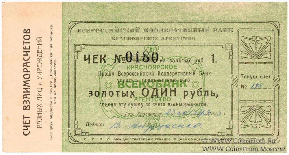 Чек 1923 г. в золотых рублях. Красноярское Агентство. Всероссийский Кооперативный Банк.