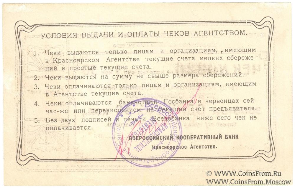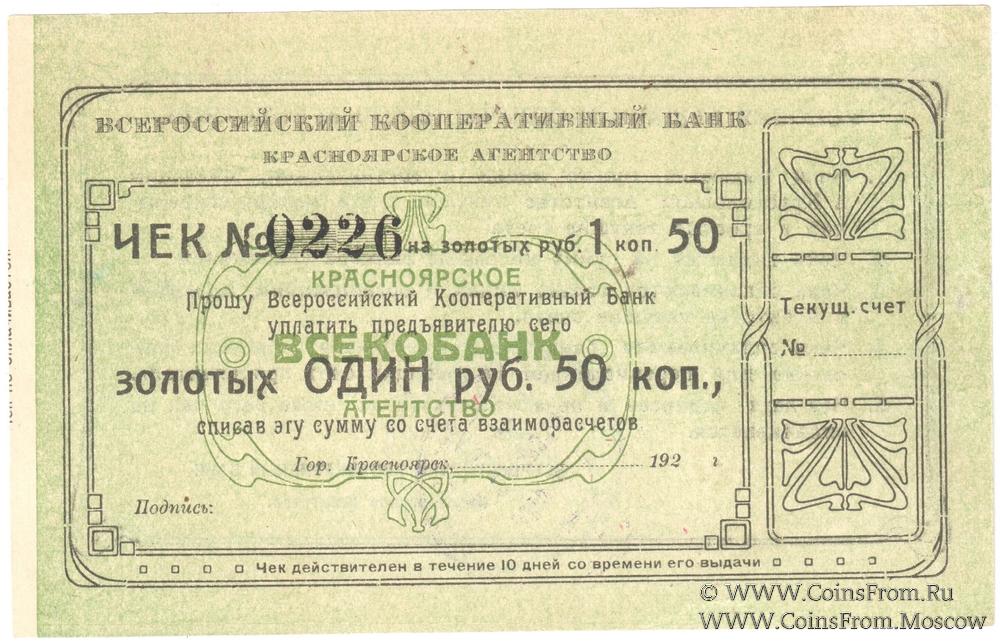 Чек 1923 г. в золотых рублях. Красноярское Агентство. Всероссийский Кооперативный Банк.