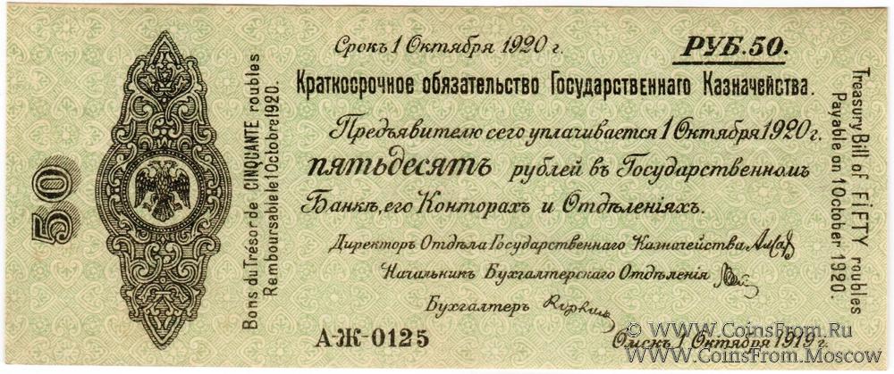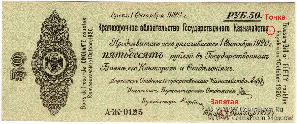 Выпуск 1 октября 1919 г. Точка после слова "Казначейства", запятая после слова "Омск". 5% Краткосрочные Обязательства Государственного Казначейства.