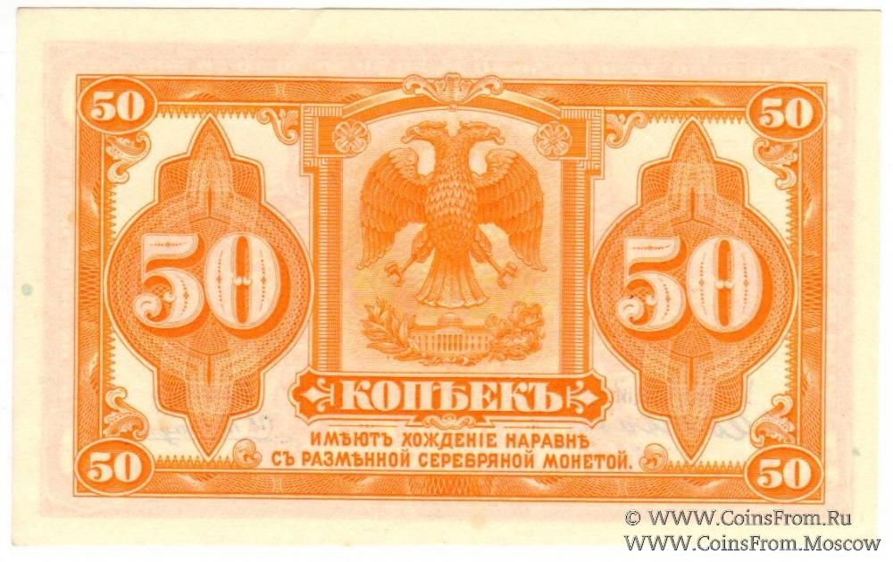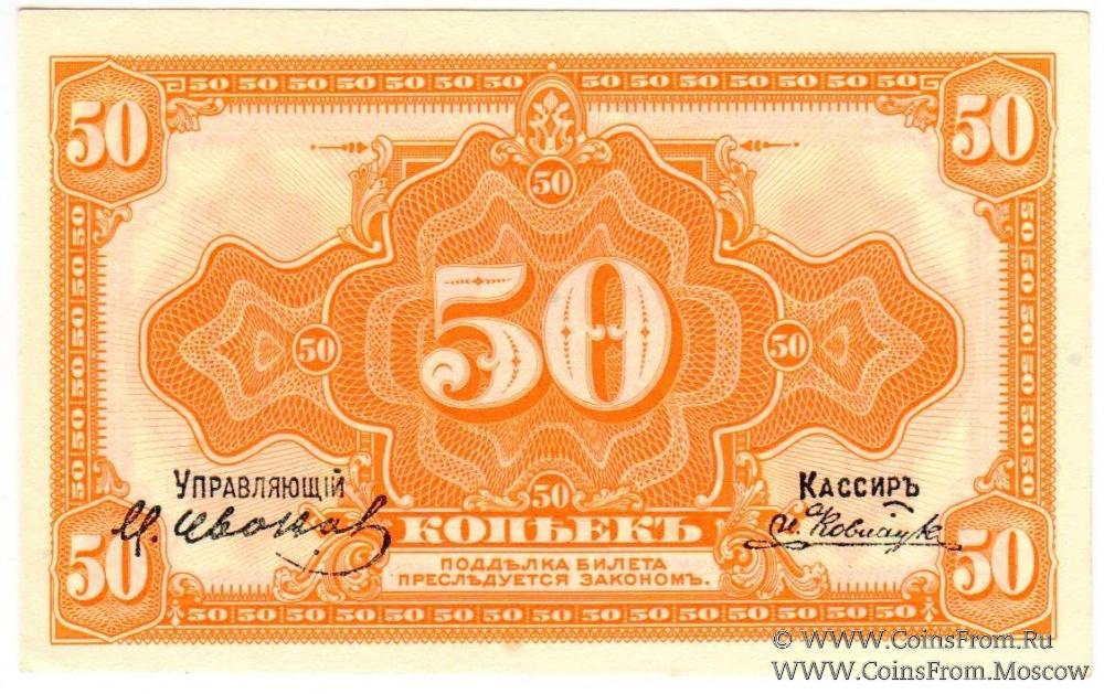 Билет (50 копеек) без даты (1917 г.). Выпуск (1920 г.) с подписями.
