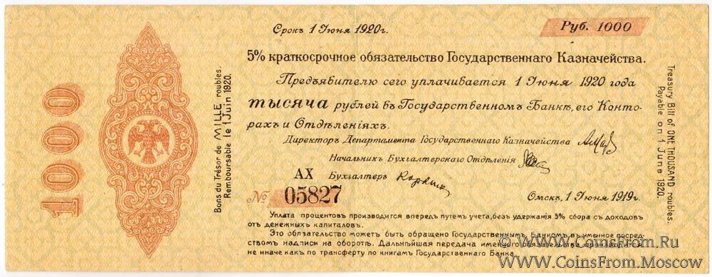 Выпуск 1 июня 1919 г. Серия АХ. Номер 5-значный, крупный. 5% Краткосрочные Обязательства Государственного Казначейства.
