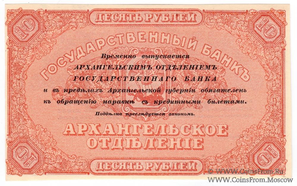 Чек без даты (1918 г.). БРАК: без подписей на аверсе, текст сдвинут вверх (отсутствует надпись "ЧЕКЪ НА ДЕСЯТЬ РУБЛЕЙ"). Архангельское Отделение Государственного Банка.