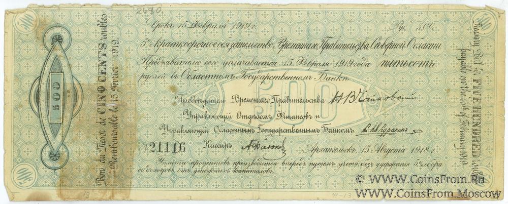 5% краткосрочное обязательство Временного Правительства Северной Области. В тексте с "и" после "финансовъ". Слово "Предъявителю..." без отступа.