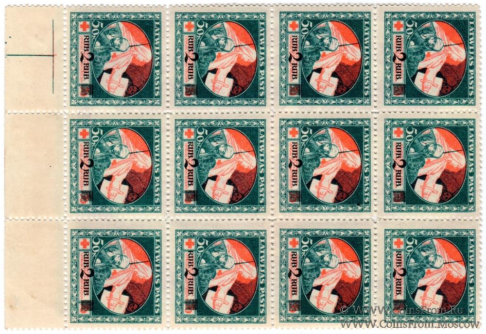 Временный разменный знак. БРАК: только реверс. Вторичное использование: Марка 50 коп. с надпечаткой 2 руб. (вариант рис. 1); латвийская почта. Перфорация.