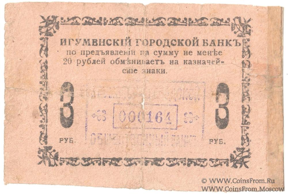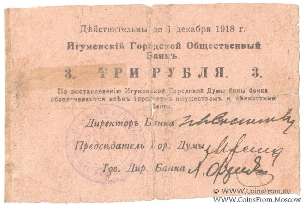 Бон. Действителен до 1 декабря 1918 г. Вариант 2 цифры "3". Бледно-розовый. Игуменский Городской Общественный Банк.