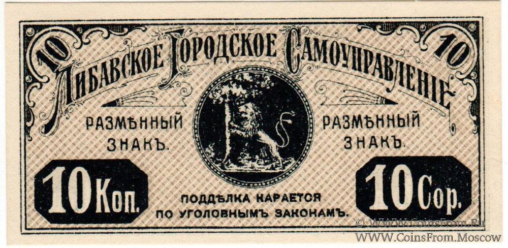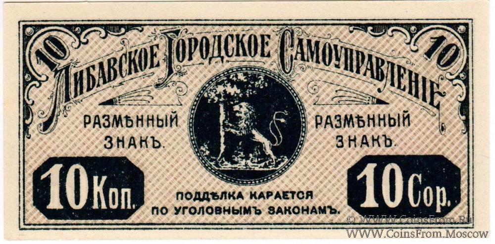 Разменный знак без даты (1915 г.). Фон серо-коричневый. Углы не очерчены тонкими линиями. Либавское Городское Самоуправление.