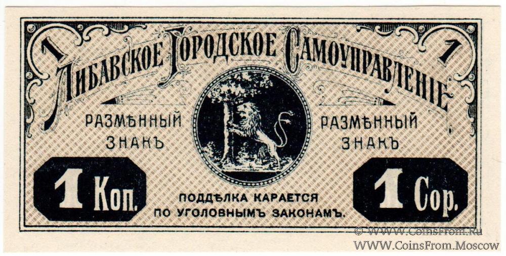 Разменный знак без даты (1915 г.). Фон серо-коричневый. Углы не очерчены тонкими линиями. Либавское Городское Самоуправление.