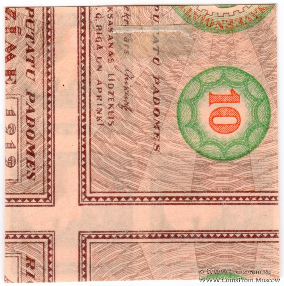 БРАК: часть аверса (10 рублей 1919 г. Рижский Совет рабочих депутатов). Вторичное использование: Марка 20 коп. без зубцов (Латвийская почта).