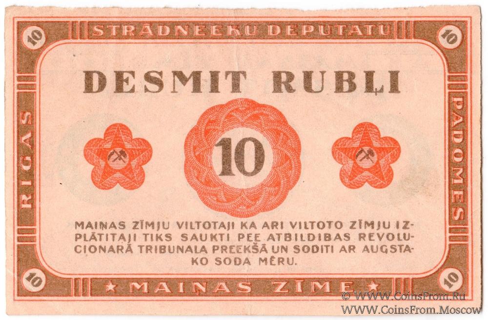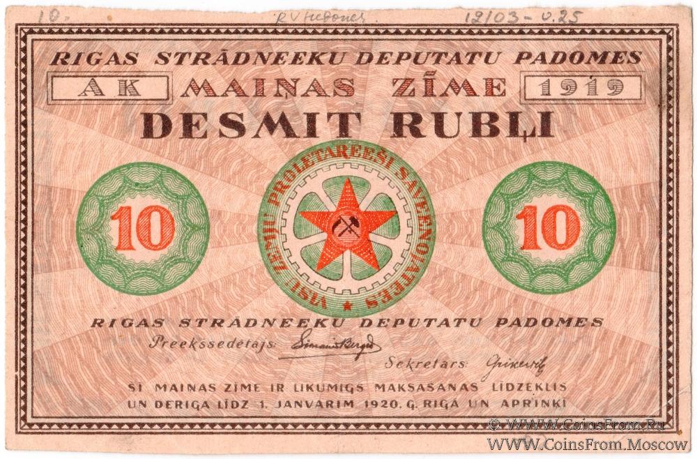 Выпуск 1919 г. БРАК: непропечатка реверса (отсутствует зелёный фон). Серия АК. Рижский Совет рабочих депутатов (Rigas Strādneeku Deputatu Padomes).