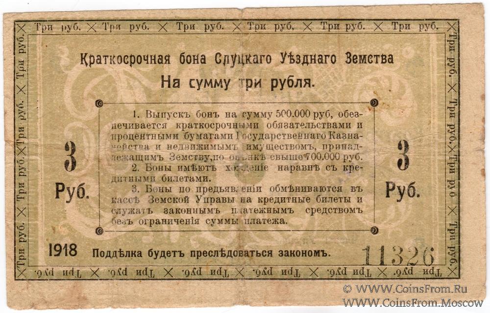 3 руб 1918 Слуцк Уездное земство № 11326 РВ