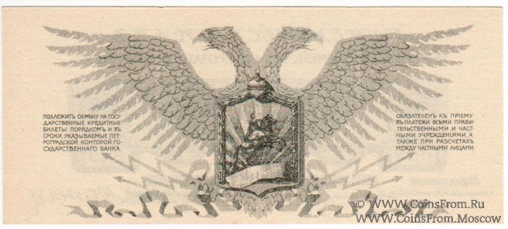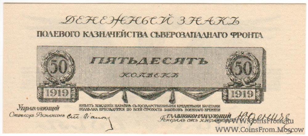Первый выпуск (без литеры): без номера, 100х44 мм. Денежный знак Полевого Казначейства Северо-Западного фронта. Типография Сверигес Литографиска Трюкериер (Швеция).