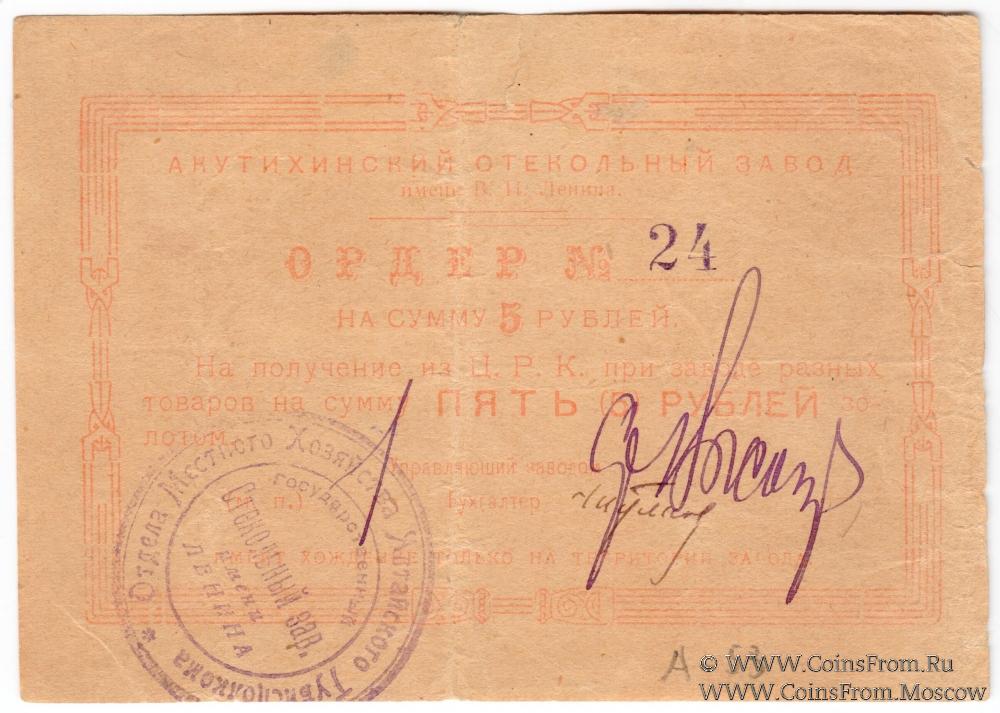 Ордер без даты (1919 г.). Печать "Государственный стекольный завод им. Ленина". Акутихинский стекольный завод им. Ленина.