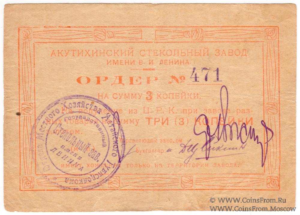 Ордер без даты (1919 г.). Печать "Государственный стекольный завод им. Ленина". Акутихинский стекольный завод им. Ленина.