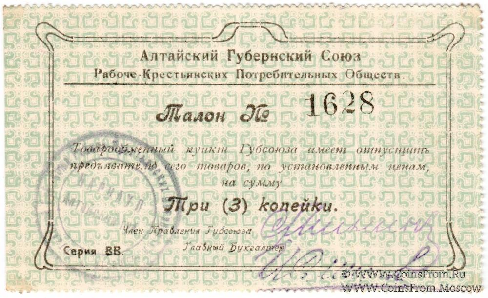 Талон без даты. Серия ВВ. Алтайский Губернский Союз Рабоче-Крестьянских Потребительских Обществ.