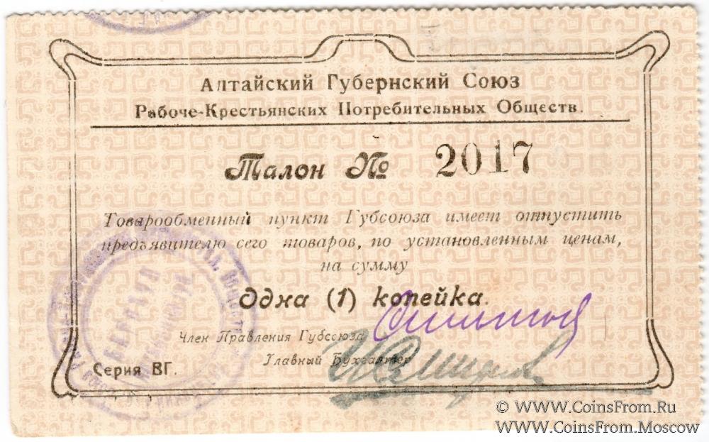 Талон без даты. Серия ВГ. Алтайский Губернский Союз Рабоче-Крестьянских Потребительских Обществ.