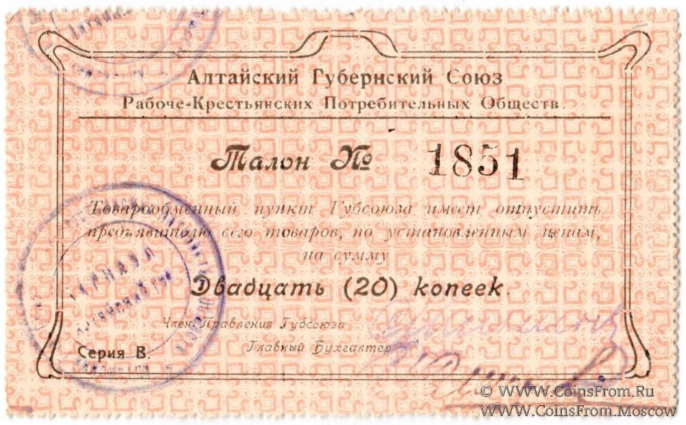 Талон без даты. Серия В. Две печати. Алтайский Губернский Союз Рабоче-Крестьянских Потребительских Обществ.