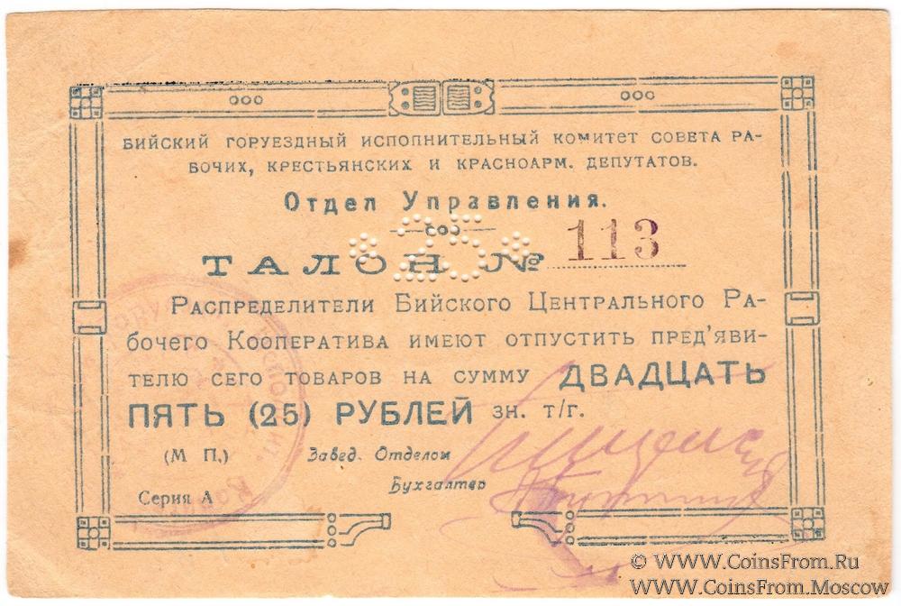Талон без даты. Перфорация "*25*". Номер 3-значный. Отдел Управления. Бийский Горуездный Исполнительный Комитет Совета Рабочих, Крестьянских и Крсноармейских Депутатов.
