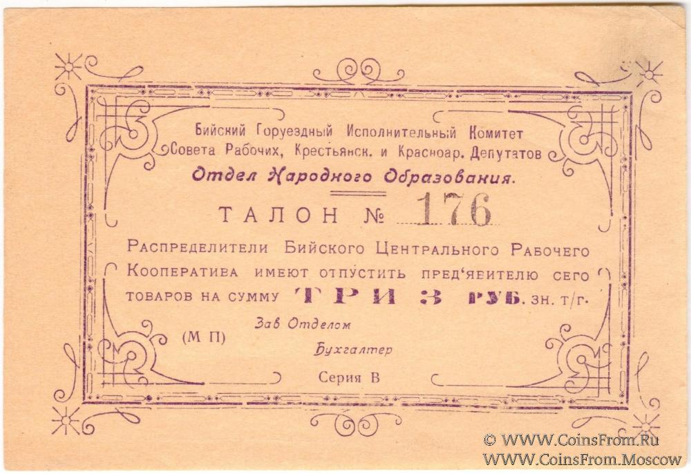 Талон без даты. Бланк. Отдел Народного Образования. Бийский Горуездный Исполнительный Комитет Совета Рабочих, Крестьянских и Крсноармейских Депутатов.