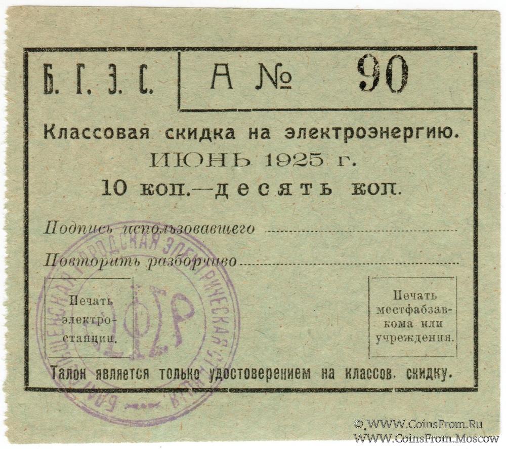 Классовая скидка на электроэнергию 1925 г. Июнь. Зелёного цвета. Благовещенская Городская Электрическая Станция (Б.Г.Э.С.).