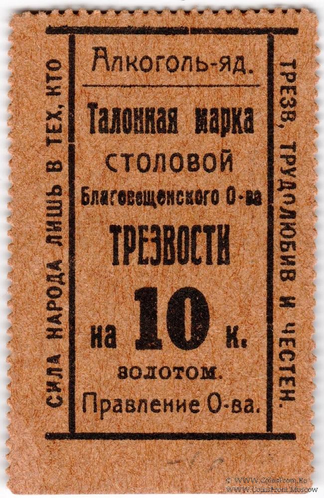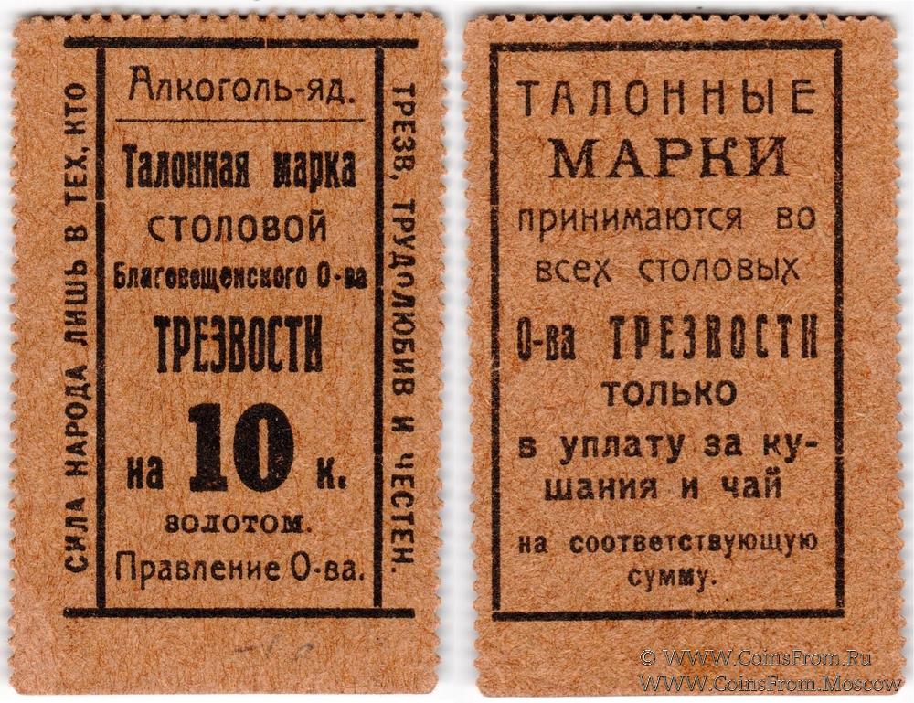 Талонная марка столовой в золотых рублях без даты (1923 г.). Благовещенское Общество Трезвости. Правление Общества.