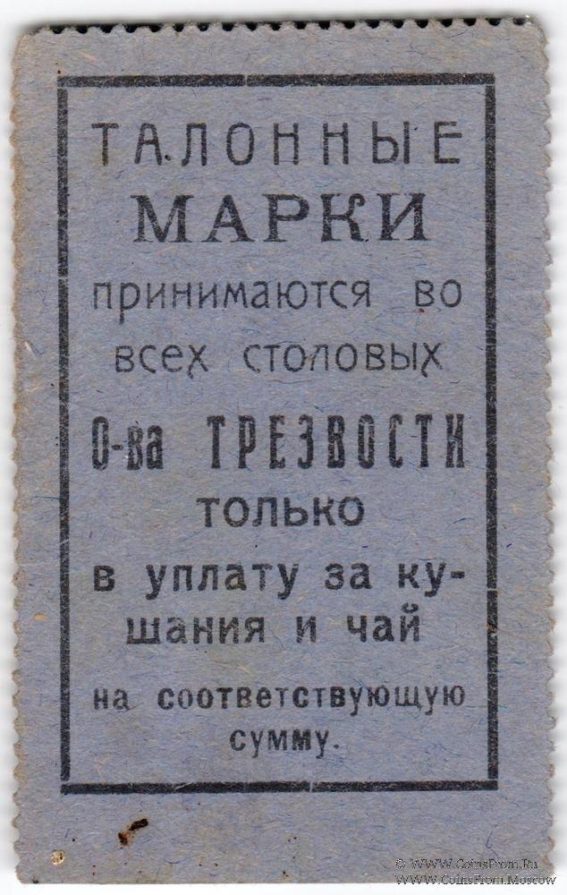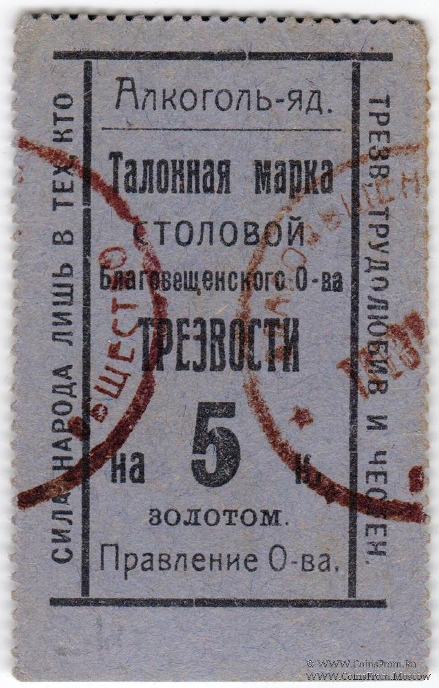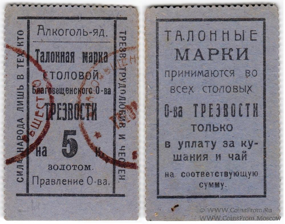 Талонная марка столовой в золотых рублях без даты (1923 г.). Две печати Общества на аверсе. Благовещенское Общество Трезвости. Правление Общества.