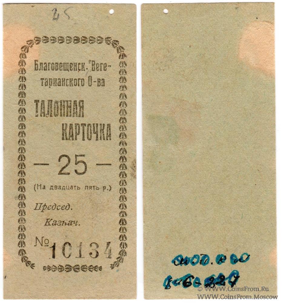 Талонная карточка без даты. Благовещенское Вегетарианское Общество.