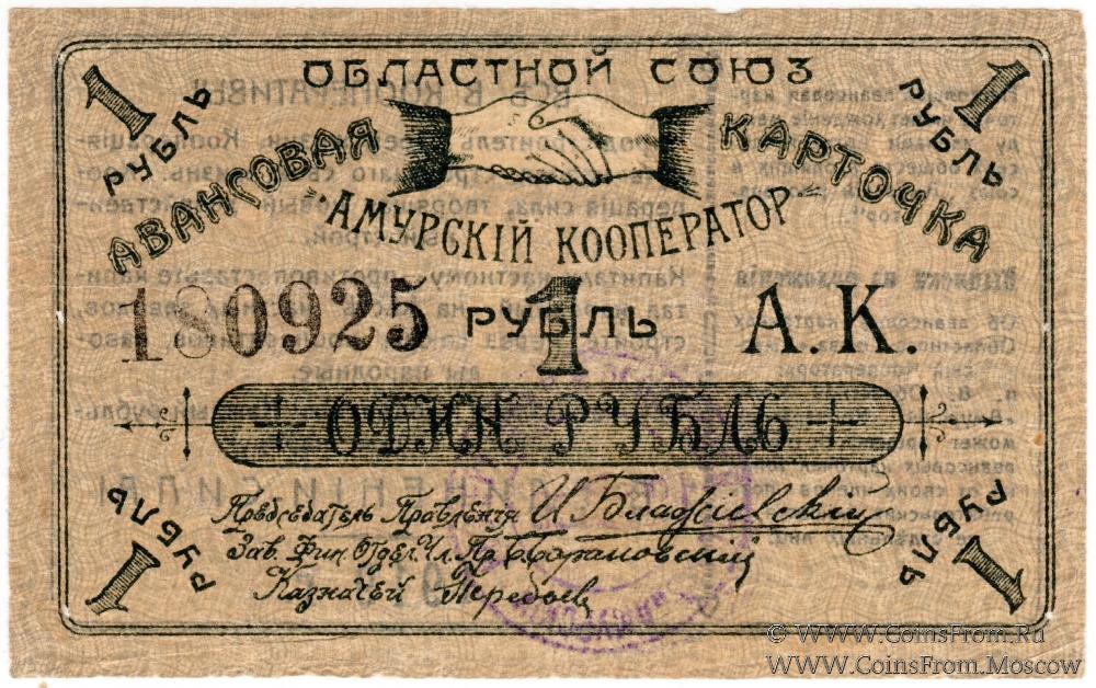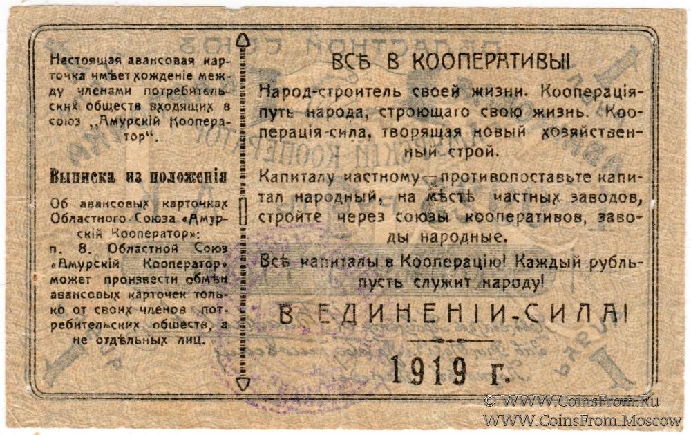 Авансовая карточка 1919 г. Текст на реверсе с выпиской из положения. Серо-желтый оттенок бумаги. Областной союз "Амурский кооператор".