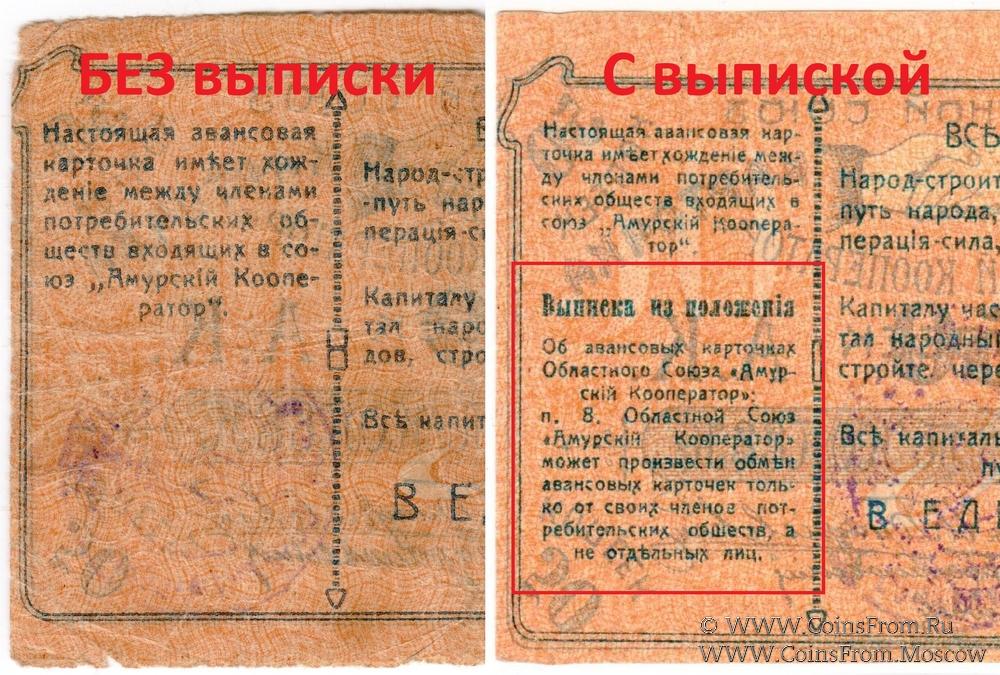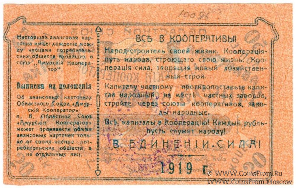 Авансовая карточка 1919 г. Текст на реверсе с выпиской из положения. Областной союз "Амурский кооператор".