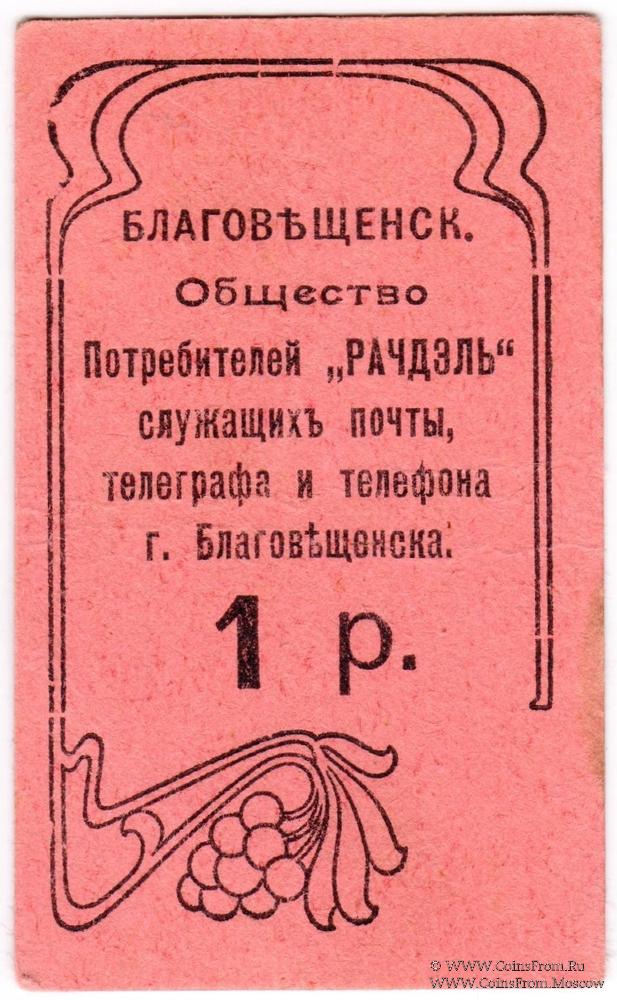 Печать на реверсе. Общество Потребителей "Рачдэль" служащих почты, телеграфа и телефона г. Благовещенска.