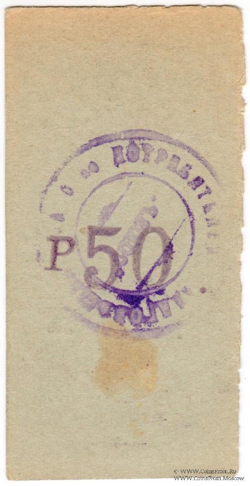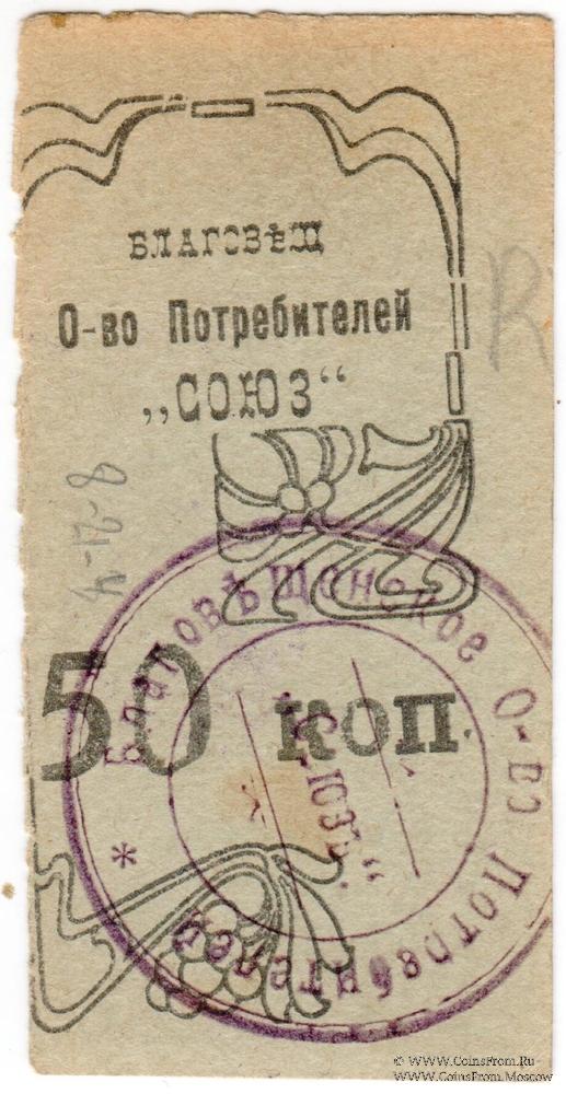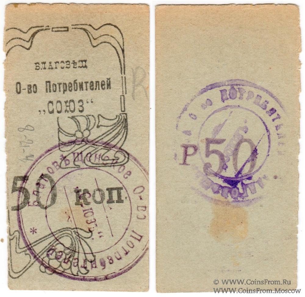 Без названия, без даты. Надпечатка нового номинала на реверсе 50 копеек. Благовещенское Общество Потребителей "Союз".