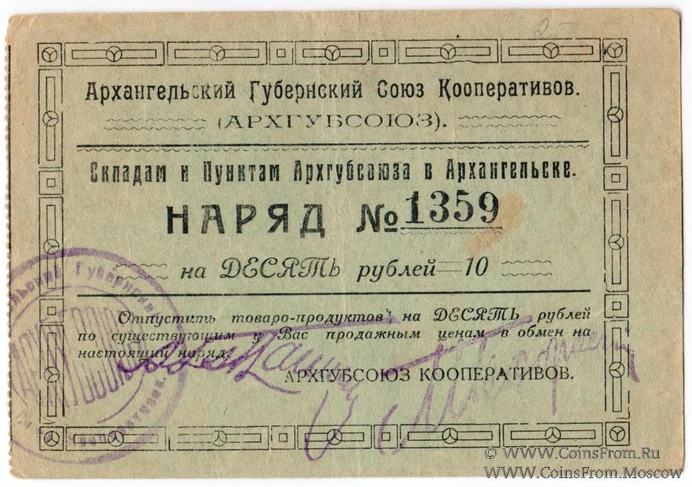 Выпуск 3. Наряд без даты (1923 г.). Бумага зелёная. Подписи факсимиле. Архангельский Губернский Союз Кооперативов (АРХГУБСОЮЗ).