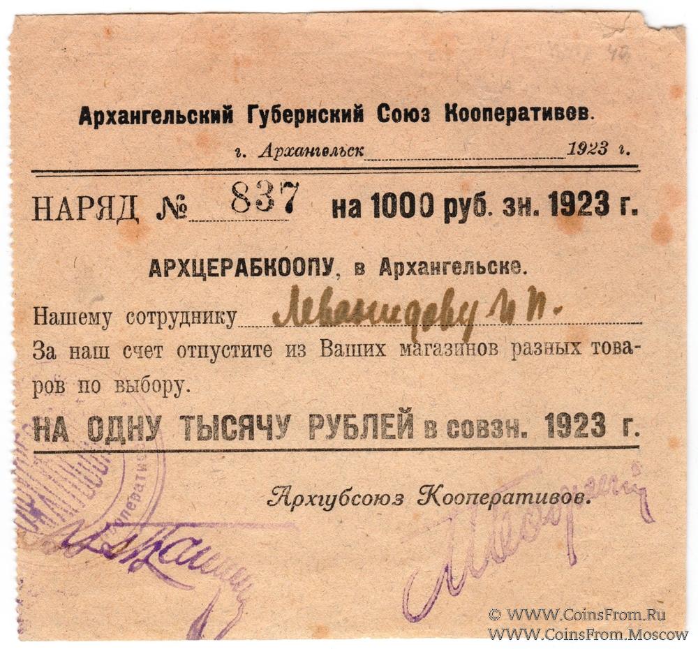 Выпуск 4. Наряд АРХЦЕРАБКООПУ 1923 г. Серо-желтая бумага. Архангельский Губернский Союз Кооперативов (АРХГУБСОЮЗ).