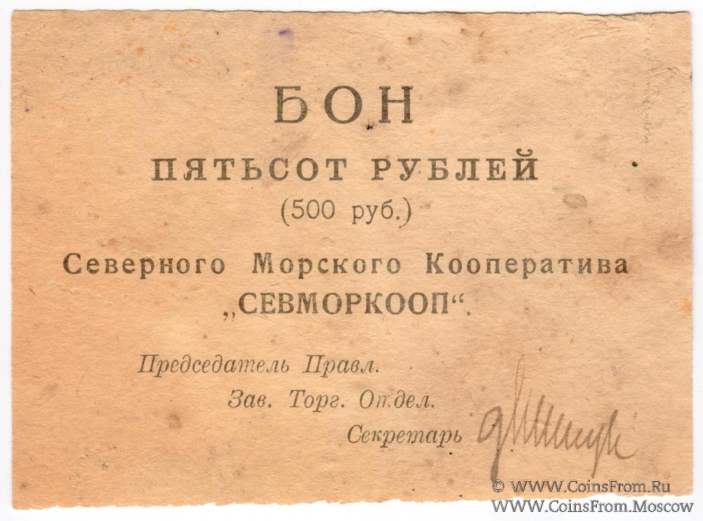 Бон без даты (1923 г.). С подписью Секретаря на аверсе. Северный Морской Кооператив "СЕВМОРКООП".
