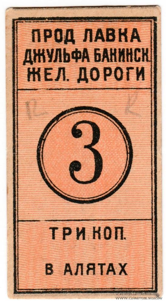 Без названия без даты (1918 г.). Фон аверса оранжевый ("3"). Продлавка Джульфа Бакинской железной дороги в Алятах.