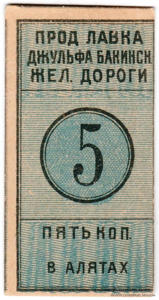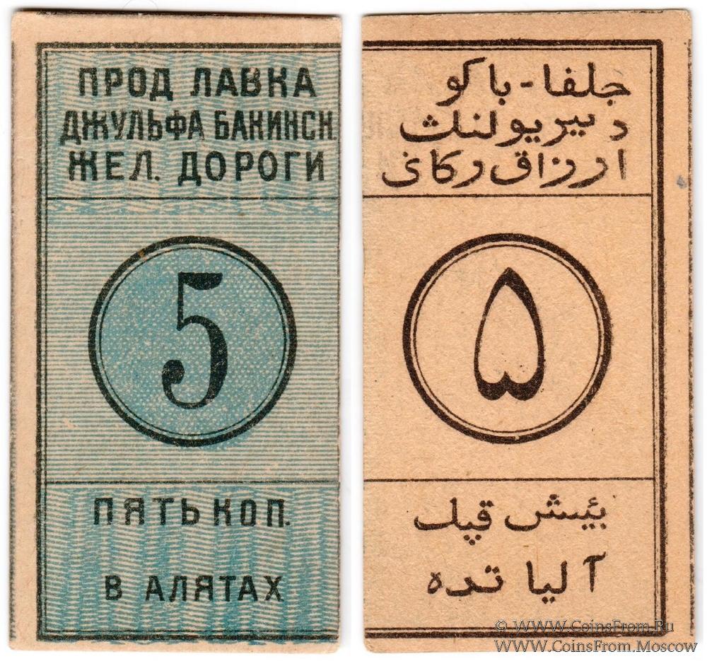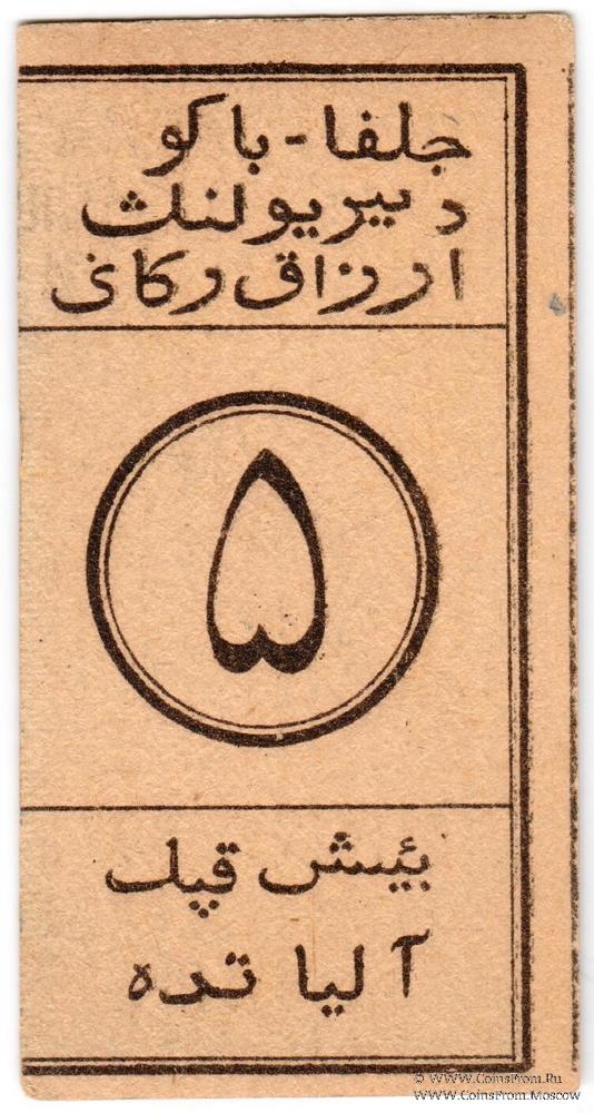 Без названия без даты (1918 г.). Фон аверса синий ("5"). Продлавка Джульфа Бакинской железной дороги в Алятах.