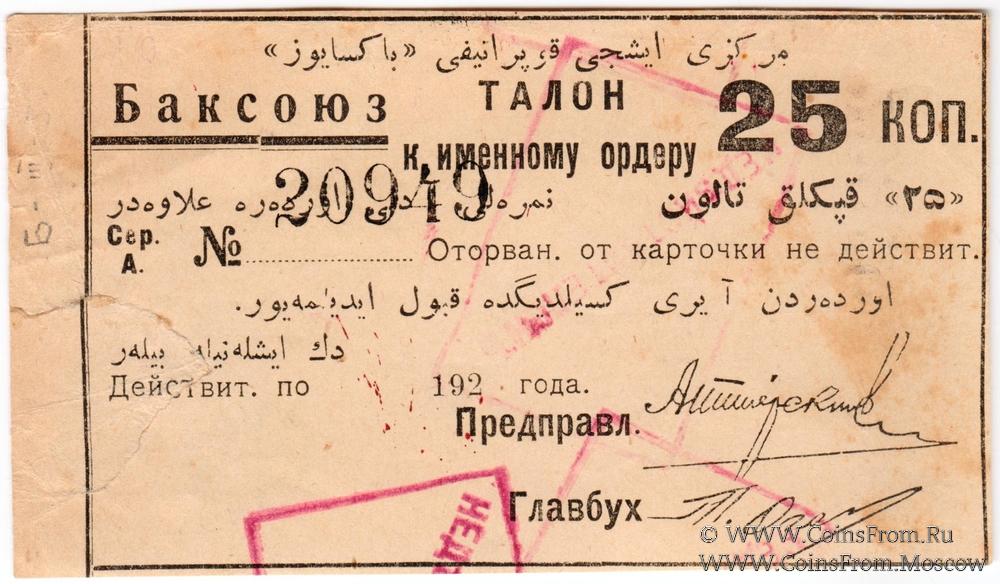 Талон к именному ордеру. Горизонтальный формат. На аверсе штамп красного цвета "НЕДЕЙСТВИТЕЛЕНЪ". Центральный рабочий кооператив "Баксоюз".