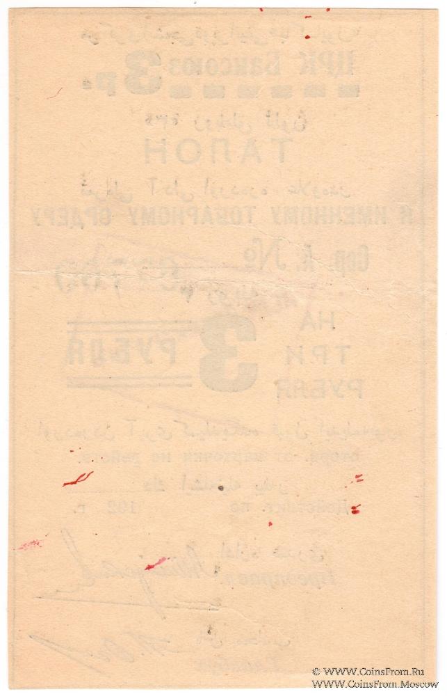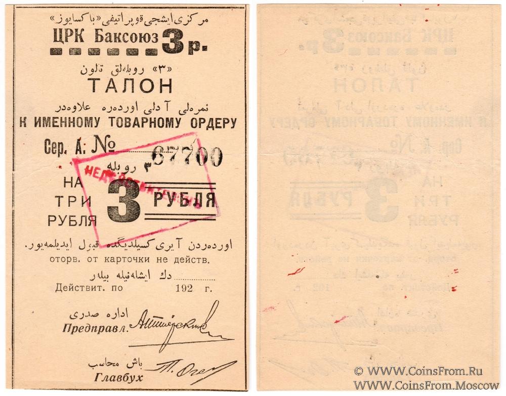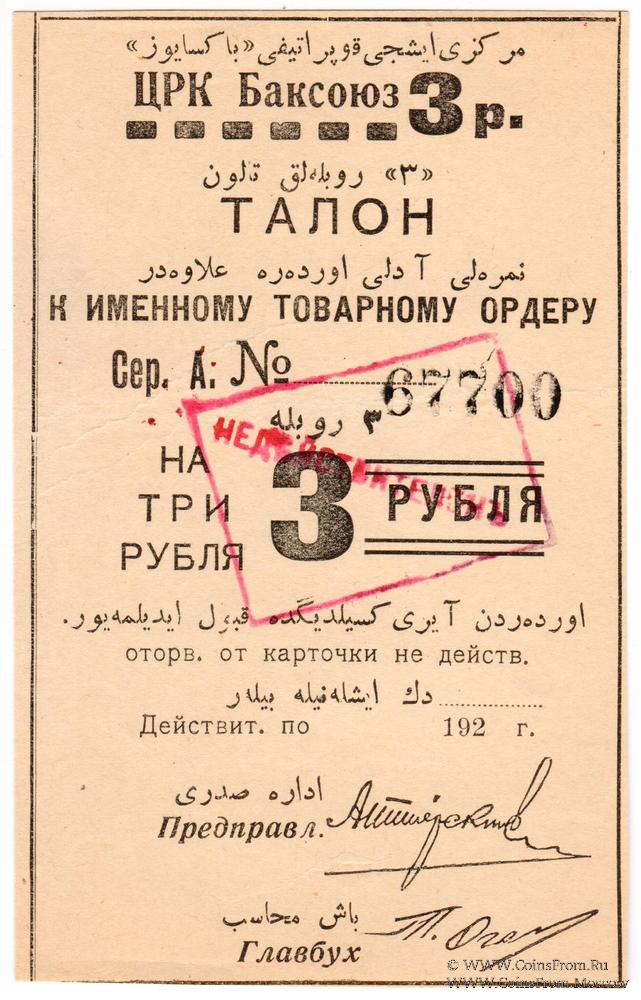 Талон к именному товарному ордеру. Вертикальный формат. На аверсе штамп красного цвета "НЕДЕЙСТВИТЕЛЕНЪ". Центральный рабочий кооператив "Баксоюз".