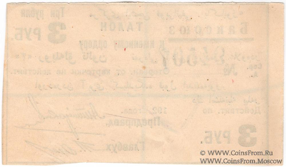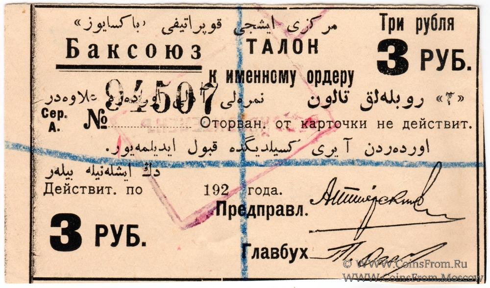 Талон к именному ордеру. Горизонтальный формат. На аверсе штамп красного цвета "НЕДЕЙСТВИТЕЛЕНЪ". Центральный рабочий кооператив "Баксоюз".
