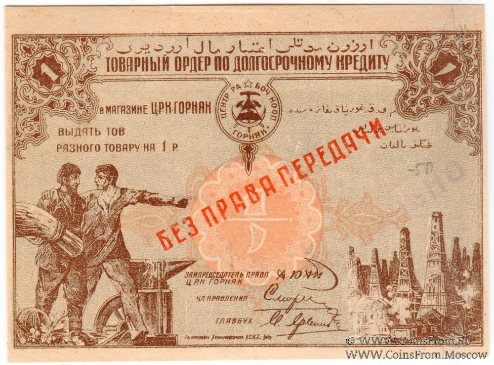 Товарный ордер по долгосрочному кредиту без даты (1920 г.). На аверсе: штамп "ПОЛУЧЕНО". На реверсе две печати. Ц.Р.К. "Горняк".