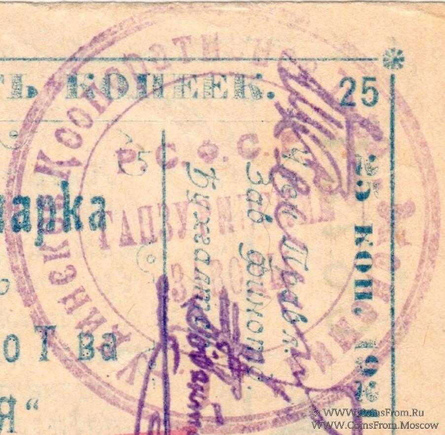 Круглая печать на аверсе: "Р.С.Ф.С.Р. / ГАНЗУРИНСКИЕ / ЗАВОДЫ" (по центру в три строки) / "В.-Удинское Кооперативное Т-во "Экономия" 8 " (по кругу)