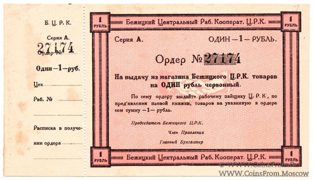 Ордер. Серия А. Бланк с корешком. Ярко-розовый фон. Бежицкий Центральный Рабочий Кооператив (Ц.Р.К.)