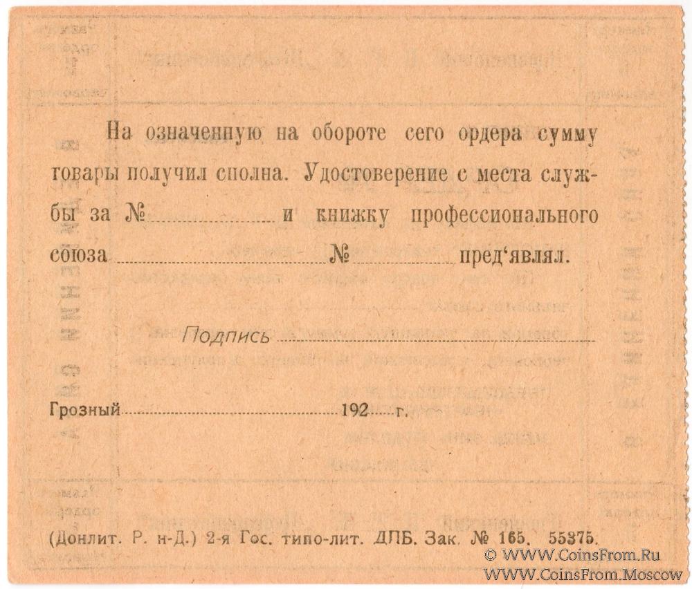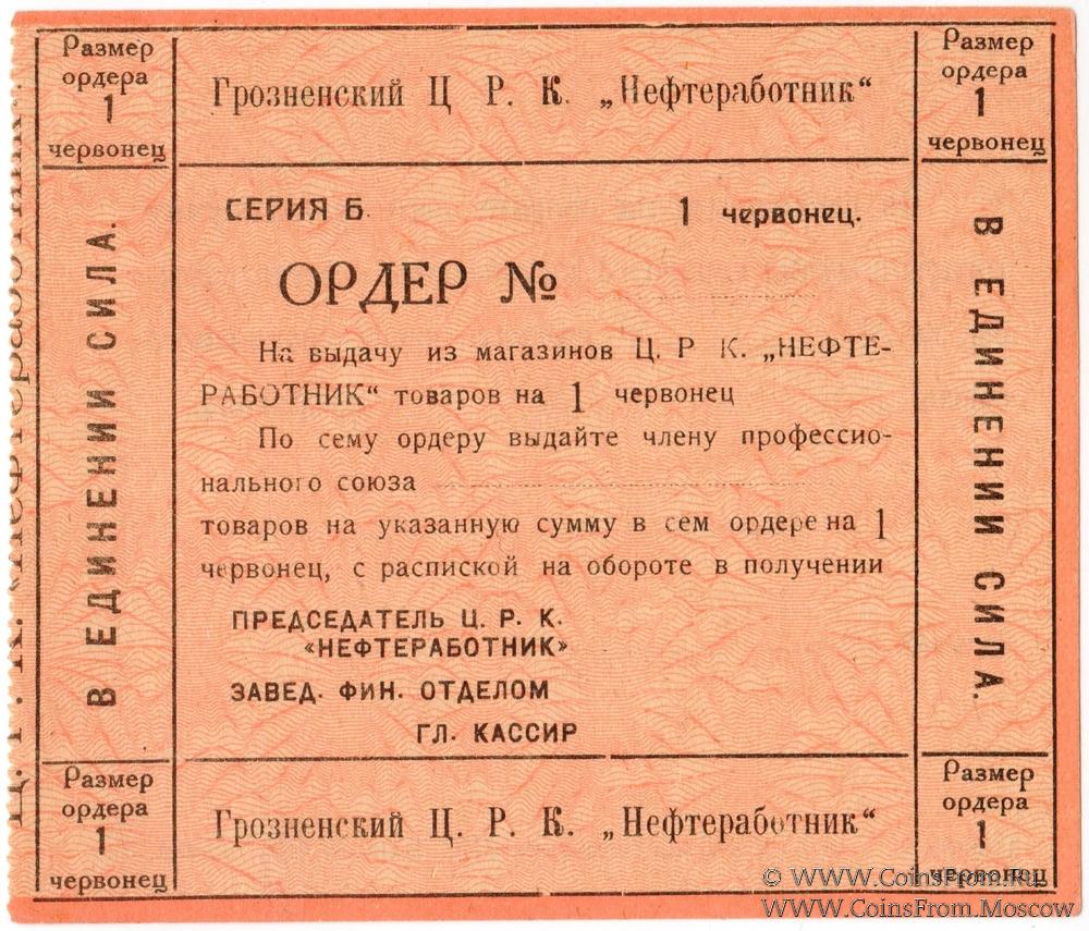 Ордер (в червонных рублях) без даты (1923 г.). Бланк. Грозненский Центральный Рабочий Кооператив "НЕФТЕРАБОТНИК".