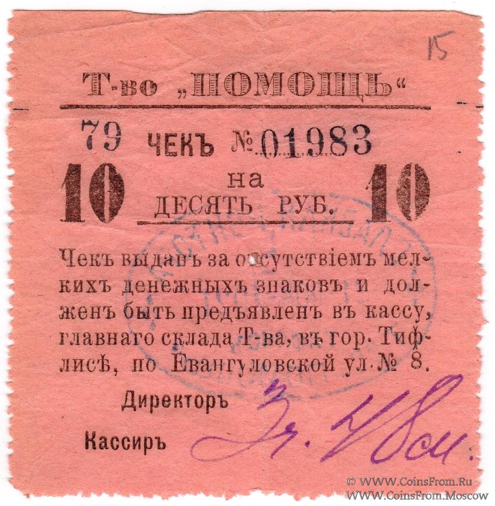 Чек. Товарищество "Помощь", г. Тифлис. Цифры номинала широкие. Буквы широкие. Реверс: овальная печать главной конторы Товарищества "Помощь".