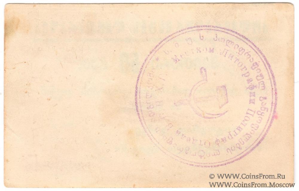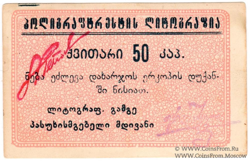 Печать круглая: Изображение серпа и молота (по центру) / "Местком Литографии Полиграф Отдела В.С.Н.Х.Г. *" (по кругу на двух языках: русском и грузинском).