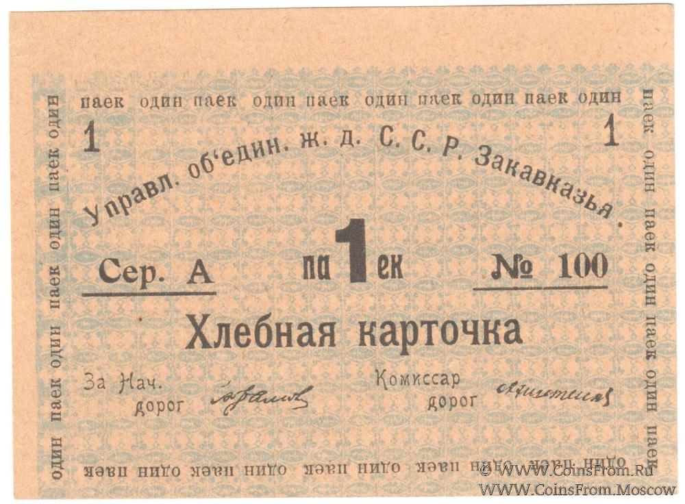 Хлебная карточка без даты. Серия А. Голубая. В верхних углах на аверсе цифра "1". Управление объединенных железных дорог С.С.Р. Закавказья.
