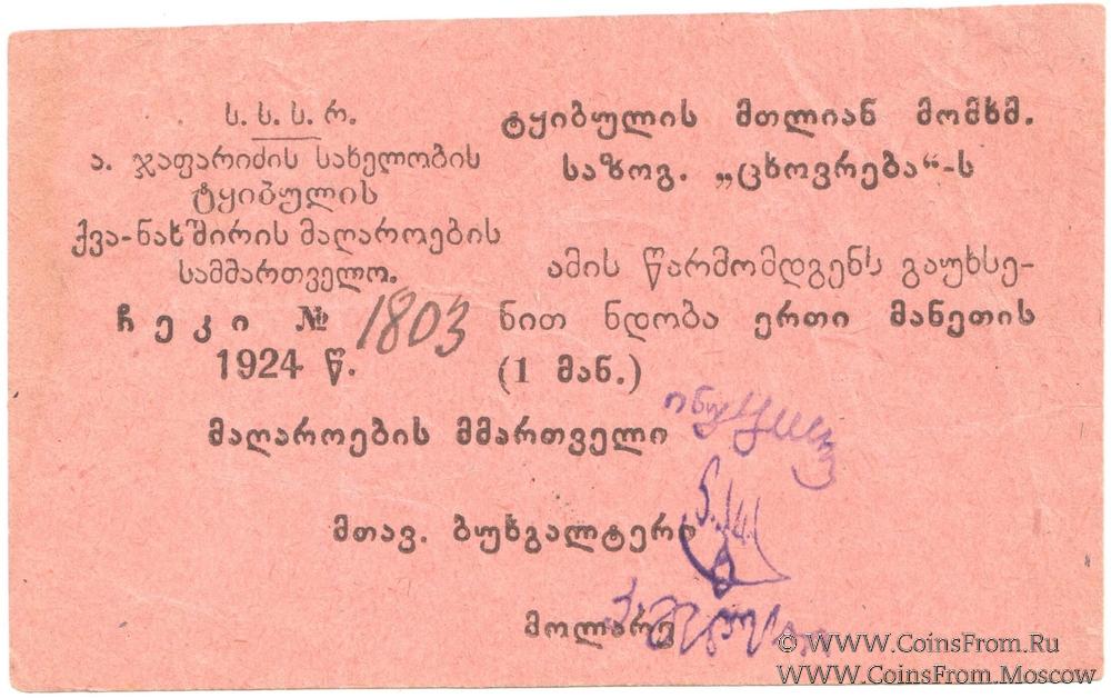 Чек. На аверсе: текст на грузинском языке, без серии, номер рукописный 4-значный, подписи факсимиле (управляющий, главбух, кассир). Печать на реверсе.
