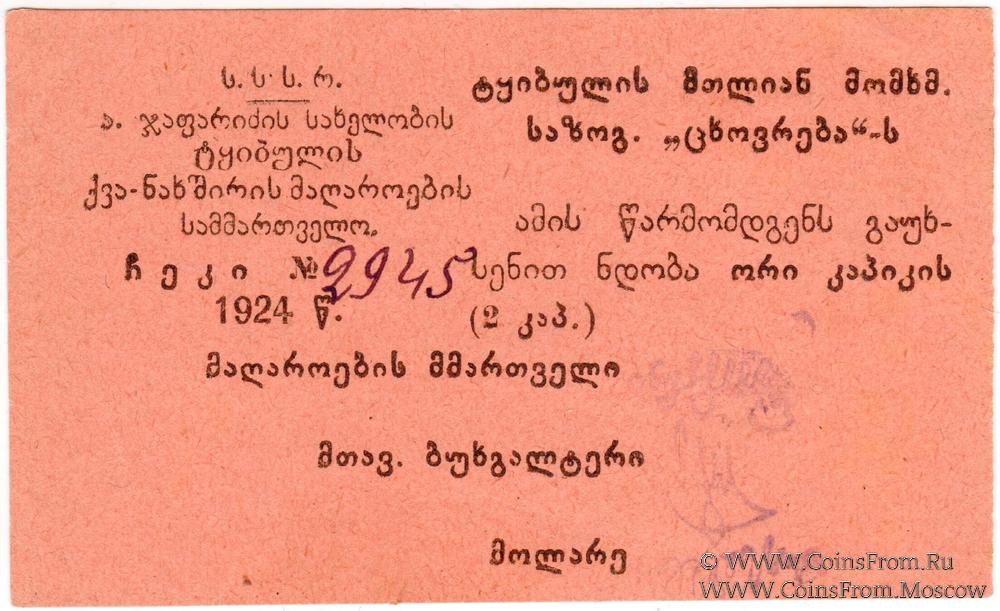 На аверсе: текст на грузинском языке, без серии, номер рукописный 4-значный, подписи факсимиле (управляющий, главбух, кассир). Печать на реверсе.