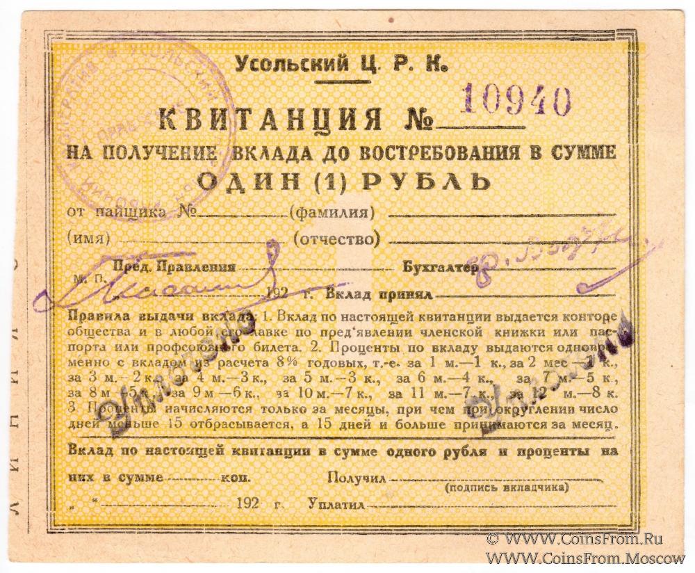 Квитанция. Желтый фон. С печатью правления на аверсе. Усольский Ц.Р.К.