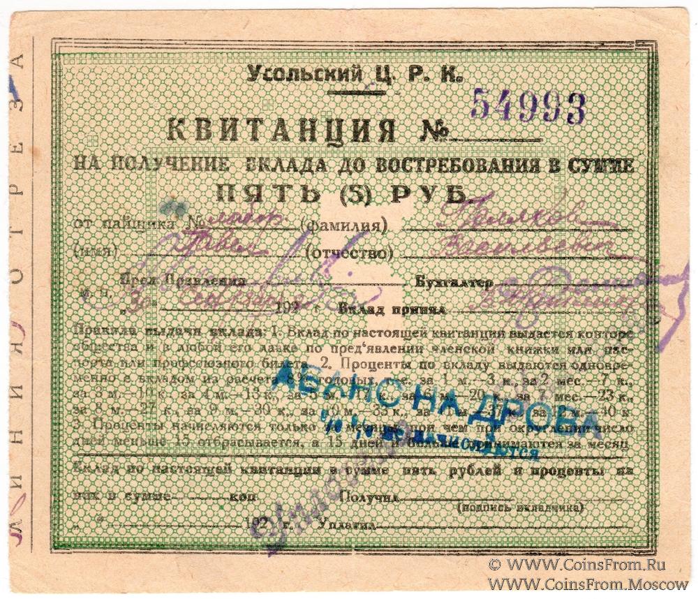 Квитанция. Зелёный фон. Без печати. Штамп в две строки: "АВАНС НА ДРОВА / %% не начисляются". Усольский Ц.Р.К.